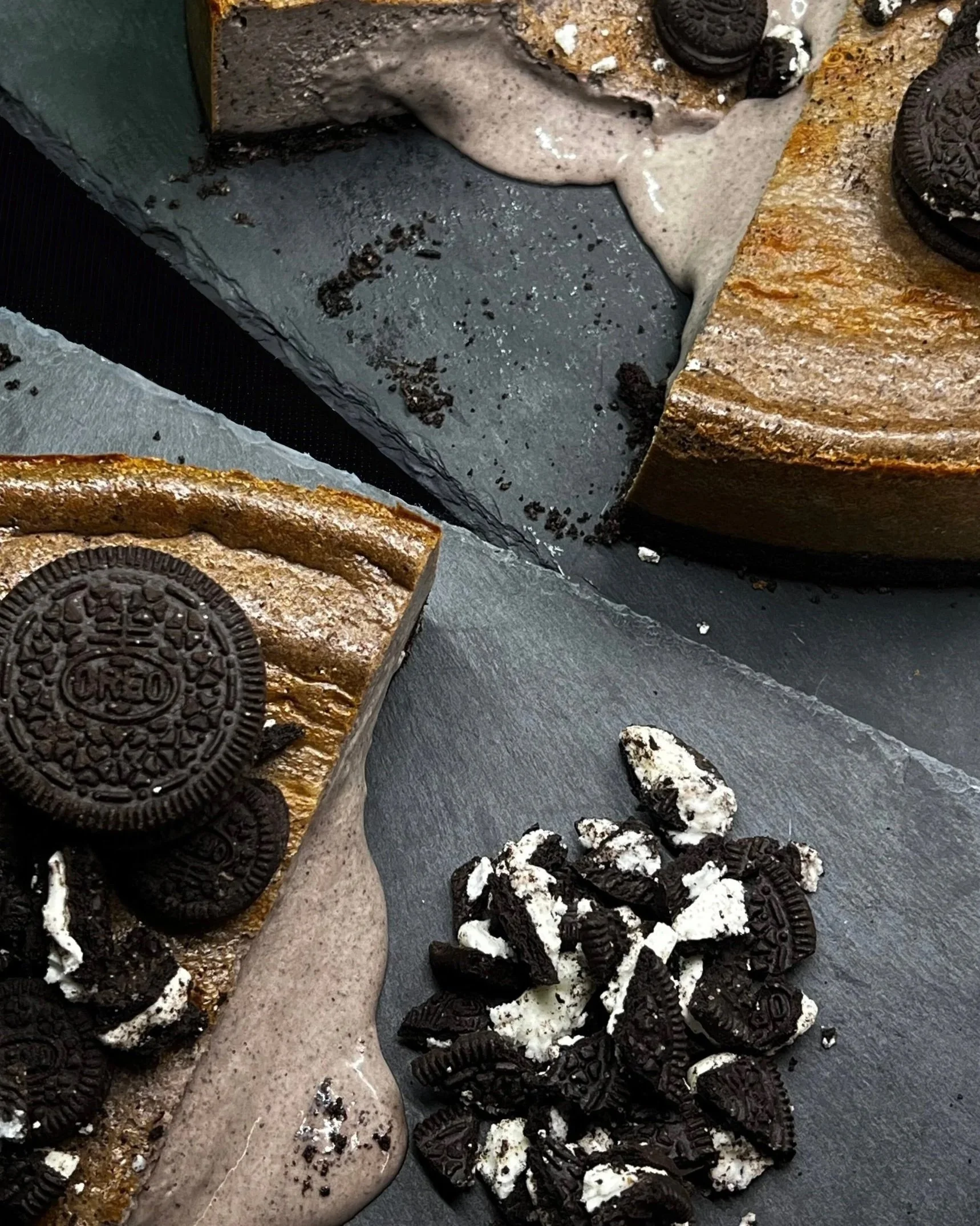 La elaboramos añadiendo en la propia mezcla del queso galleta oreo triturada, así rebajamos su dulzor hasta encontrar un punto perfecto.